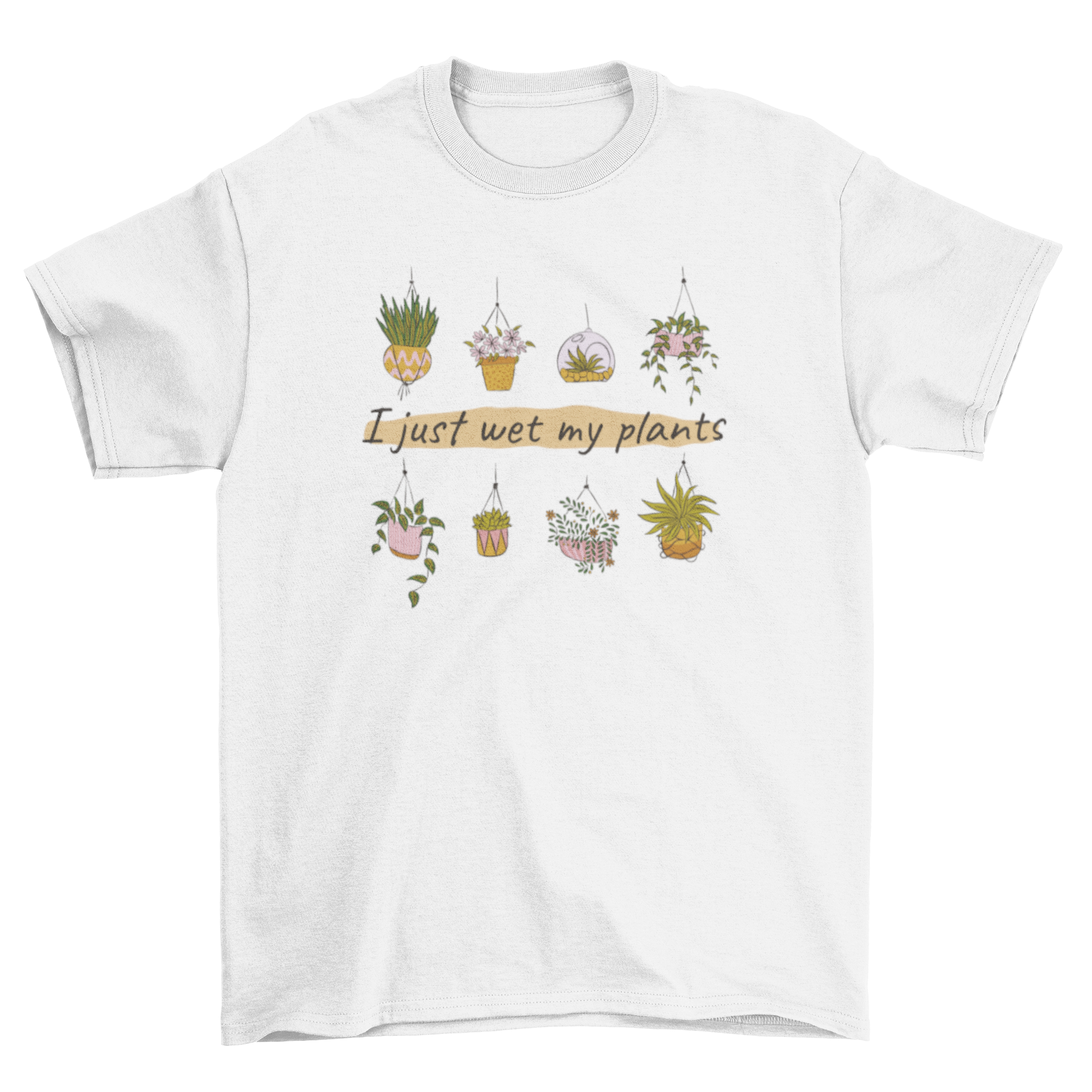 This awesome gardening t-shirt design includes many hanging houseplants and the quote 'I just wet my plants'.
